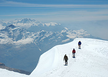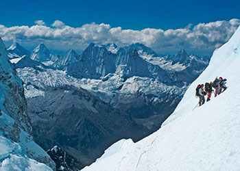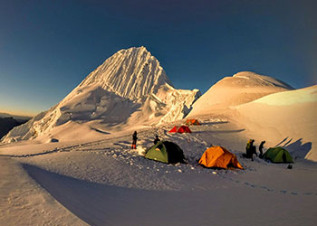 Vista das montanhas - Três Picos Perú - Urus (5.495 m), Ishinca (5.530 m) e Tocllaraju (6.034 m). Escalada até Ishinca (5.530 m), travessia de trekking na Quebrada Ishinca, é um receptivo popular para os escaladores que desejam alcançar 5 ou 6mil, mas devido à beleza cênica, mesmo sem um pico de escalada muito interessante.