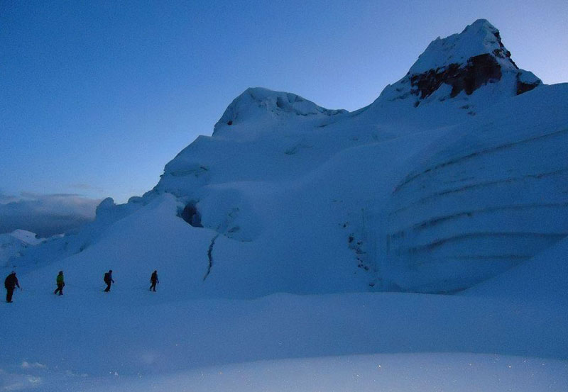 Partida do campo da morena aproximadamente das 2 às 3. da manhã. para chegar ao cume por volta das 8h. Nesta seção da morena até o topo da geleira, levamos de 5 a 6 horas. Depois de chegar ao cume, retornaremos novamente ao ponto de partida que se torna o desfiladeiro de Llaca, onde o ônibus nos espera para retornar à cidade de Huaraz.