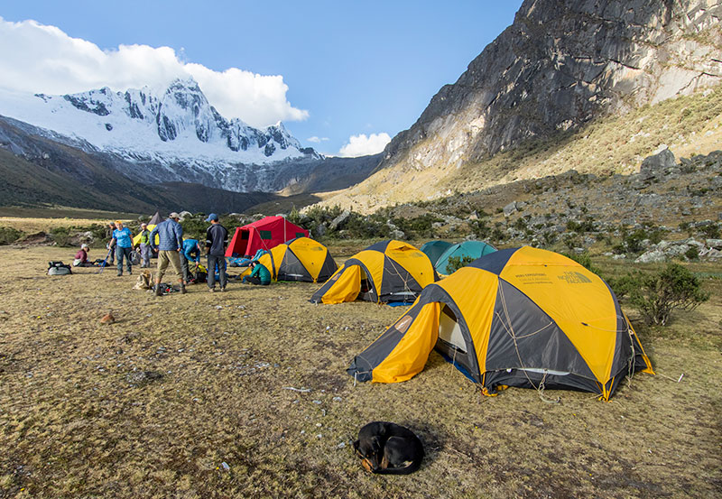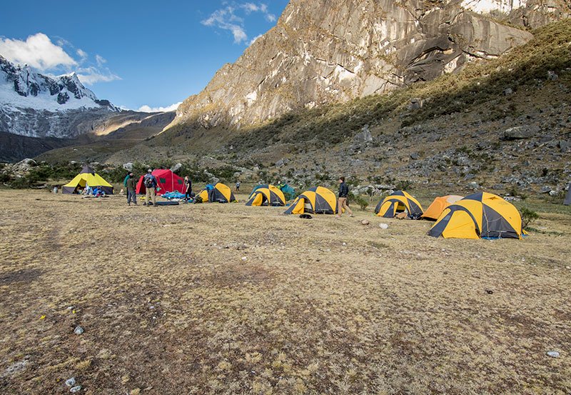 Nas próximas duas etapas, chegamos ao ponto mais alto de nossa caminhada, na cabana de Pisco "Refugio Perú", nosso acampamento base de 4.680 m. A perspectiva das costas do Nevado Huascarán e Chopicalqui é esmagadora: o Huascarán está com seus 6.768 metros da montanha mais alta do Peru. Pernoite em Peru Hut. Apreciamos a vista dos picos de Huandoy, Chacraraju e Yanapaccha.