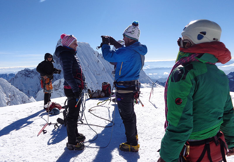 Pouco depois da meia-noite, deixamos o abrigo, escalamos, atravessamos a morena alongada e chegamos ao glaciar. Uma subida íngreme nos leva à sela do Pisco Nevado. Agora, a longa escalada final sobre a geleira do pico de 5.752 metros da Cordilheira Blanca! Agora temos uma vista magnífica da montanha mais alta do Peru - Huascarán, também nas proximidades, e Huandoy Chopiqualci e muito mais.