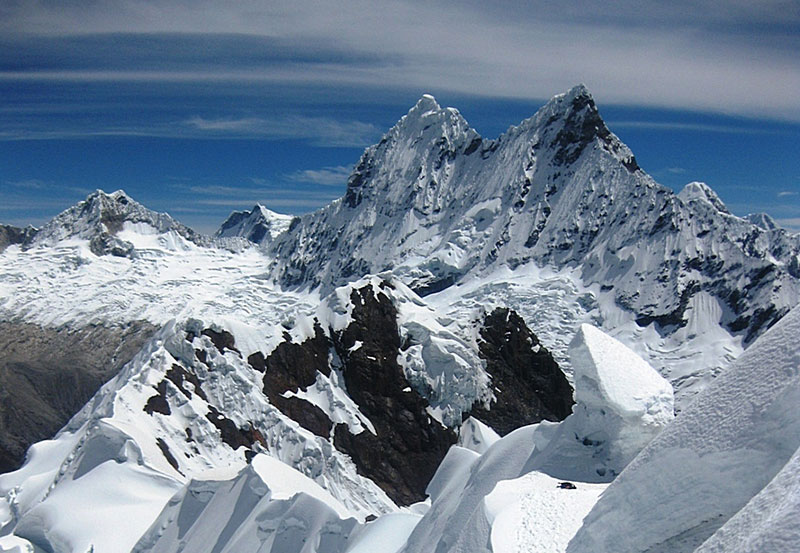 Subimos a Quebrada Santa Cruz e depois atravessamos as lagoas Ichiccocha e Jatuncocha. Nas margens de árvores encantadas e tremoços em todos os tons de azul. Um paraíso para os patos locais. Em seguida, vá para a lagoa Arhueycocha (4450 m), ao mesmo tempo, o ponto de partida para Alpamayo. Desfrutamos de uma vista fantástica sobre o Alpamayo, Quitaraju, Artesonraju (logo da Paramount Pictures) e o cume de Garcdilazo e os párias nevados. Muitas pessoas estão convencidas de que a forma da pirâmide branca que é o Alpamayo é a montanha mais bonita do mundo!